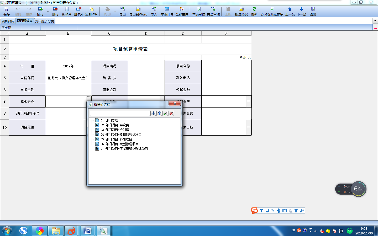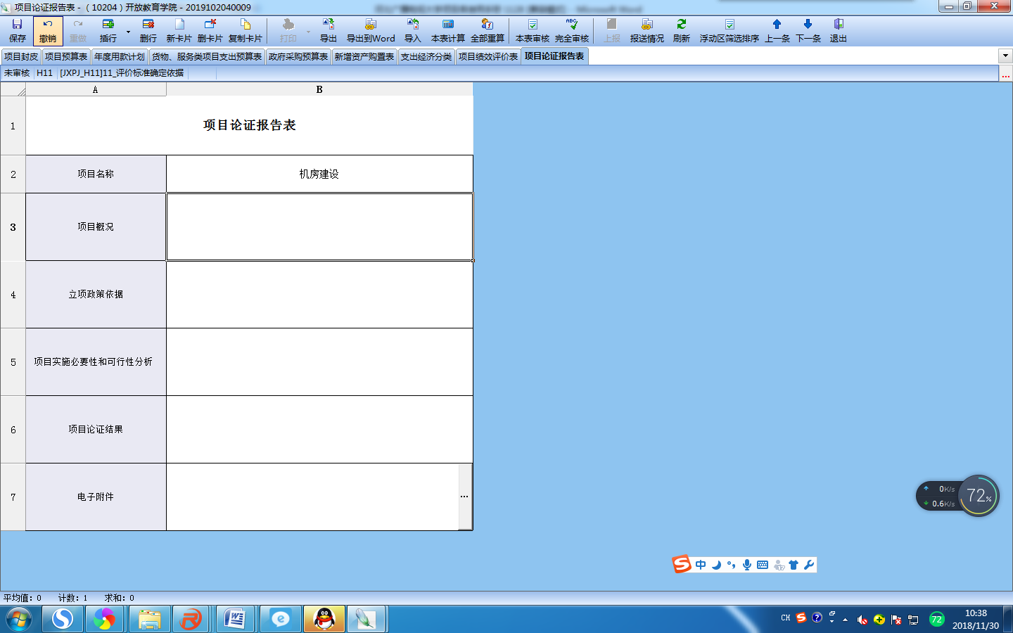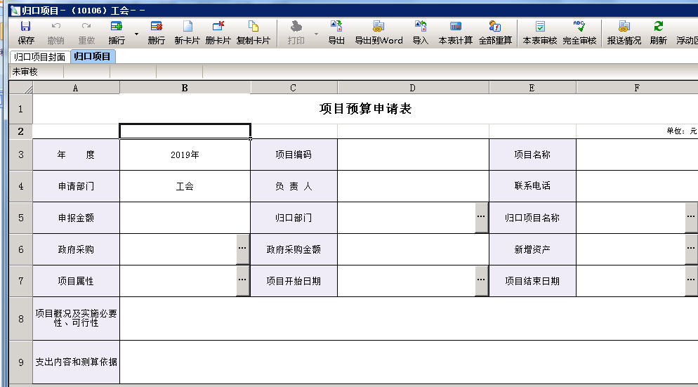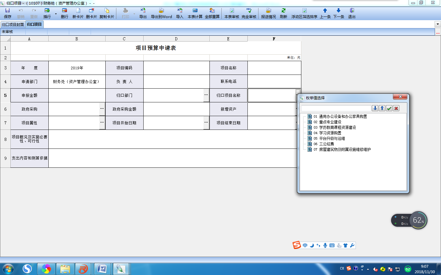 选择对应的归口部门和归口项目,填写完成后保存,软件会自动显示所需填写的辅助表。(项目编码保存后自动生成)
