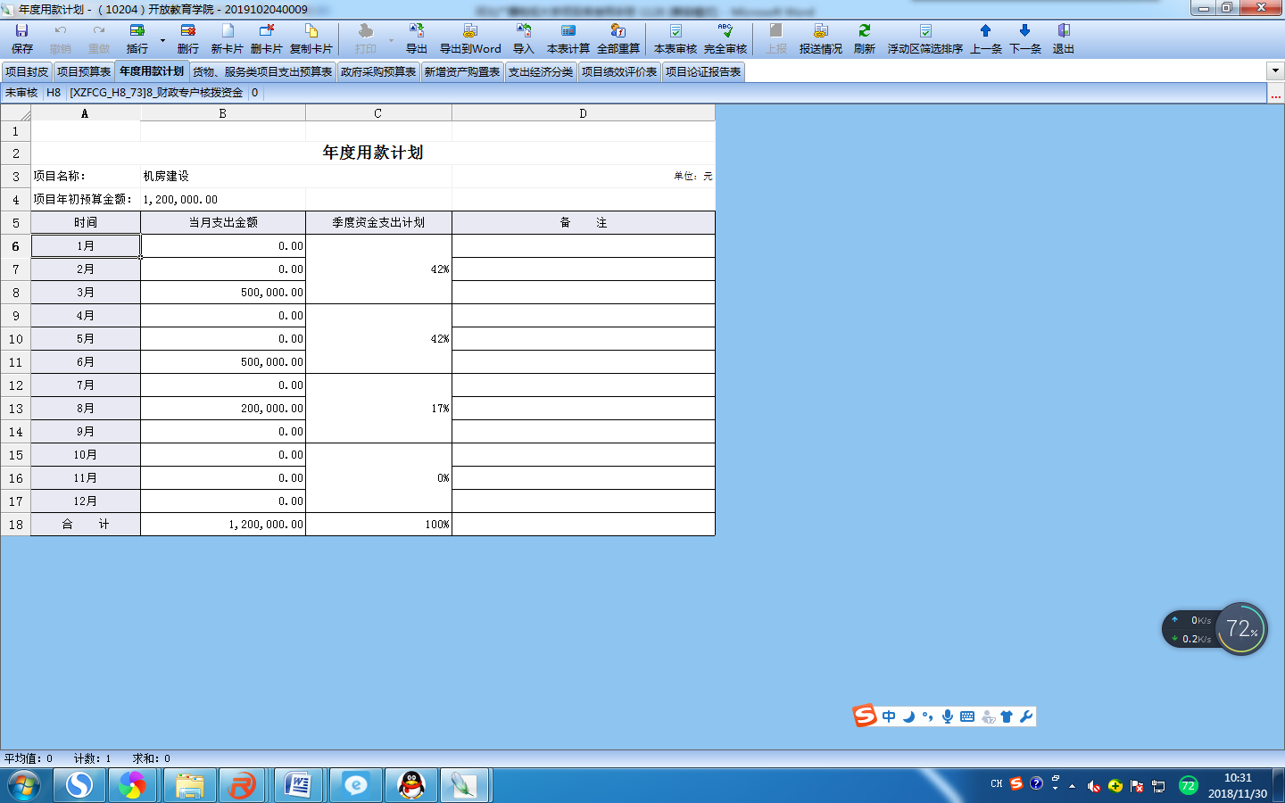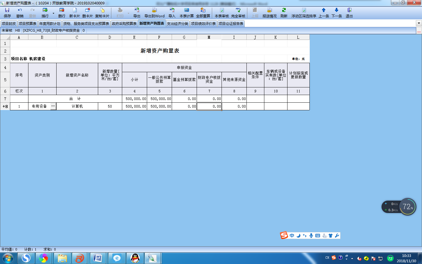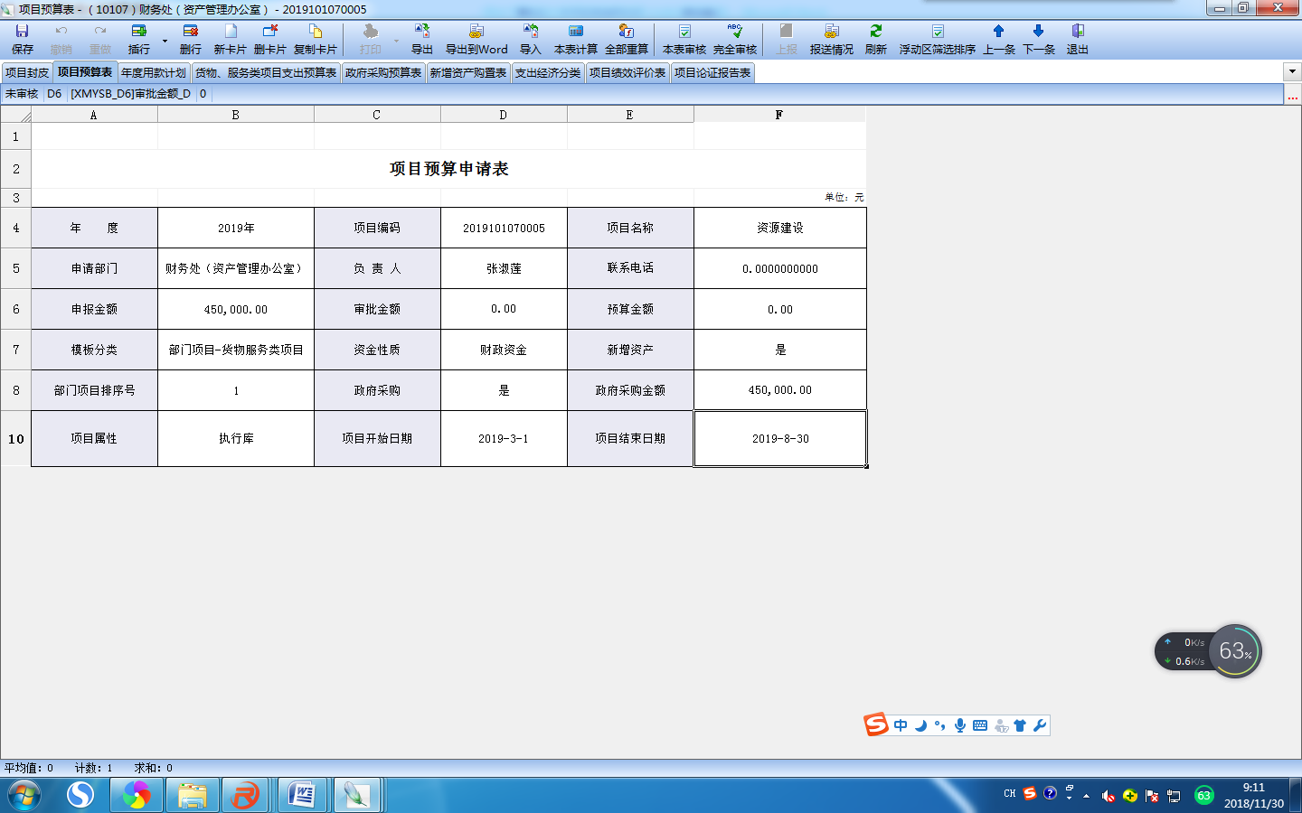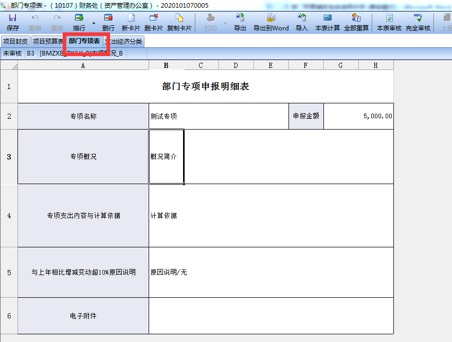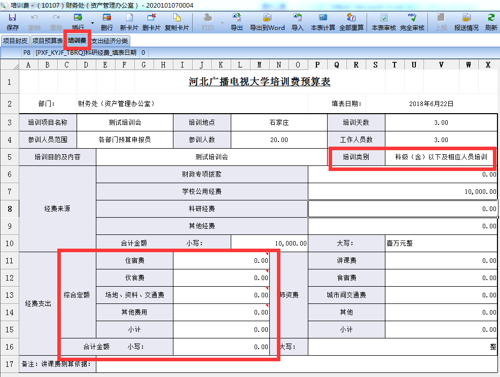根据实际情况进行填写信息,填写完成后“完全审核”--“上报”;部门负责人“批准”后上报财务处。